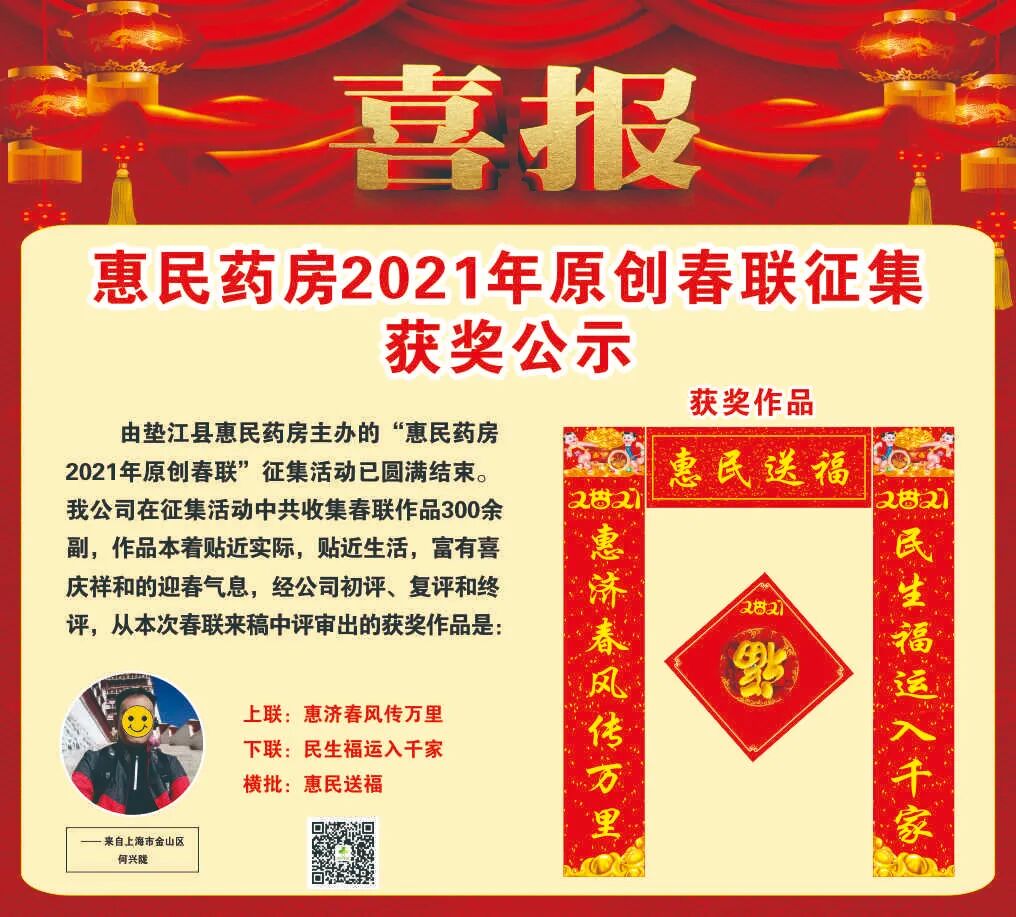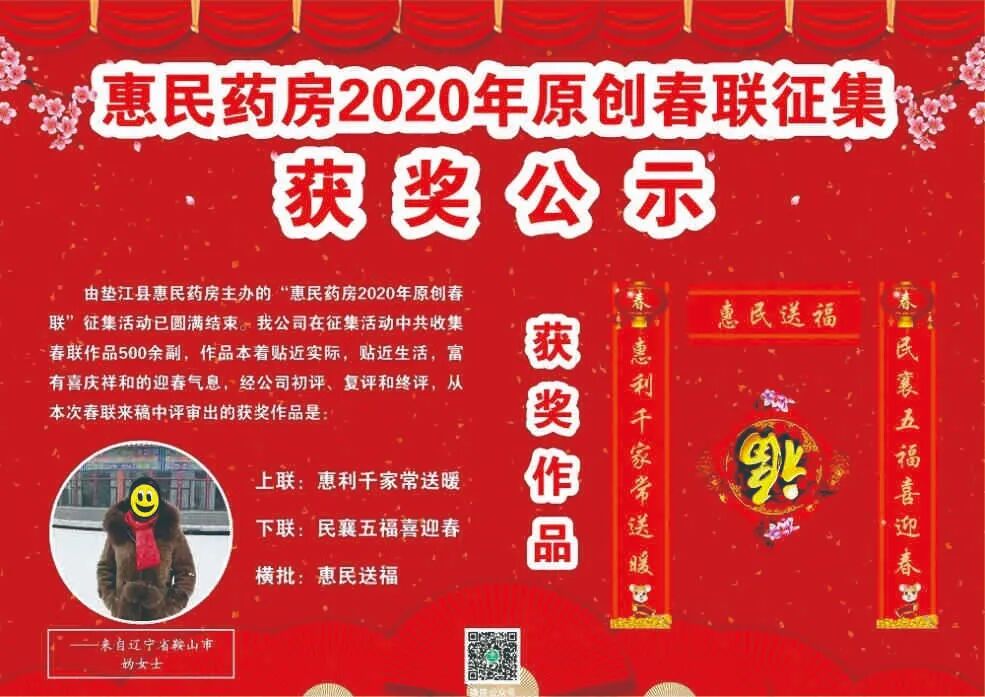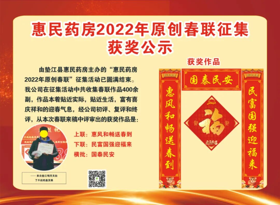 活动主题春节——阖家团圆、举国同庆的重要传统节日,贴春联、挂灯笼是一项特别的传统民俗,为了弘扬中华优秀传统文化,唱响主旋律,讴歌新时代,表达新愿景,营造浓厚节日气氛,惠民药房特面向社会征集原创春联,具体方案如下: 一:活动主题 龙年将至,喜迎新春!每逢春节书写春联,张贴春联以烘托节日气氛,已成为一种风尚,深入千家万户。贴春联,挂灯笼是一项特别的传统民俗,为了弘扬中华优秀传统文化,讴歌新时代,表达新愿景,营造深厚节日气氛,惠民药房特面向社会原创春联征集活动具体方案如下: 二:征集时间 2023年12月25号-2024年1月5号 三:投稿方式: ②接收微信公众号留言 ③惠民药房各门店接收报送稿件(纸质) 备注:来稿需注明作者姓名,单位或者住址,联系电话等。 四:征集要求: ①:春联作品创作必须带有“惠民”字眼 ②:符合春联韵律要求 ③应征春联作品须原创,不得抄袭,转载或改编。剽窃他人或侵权行为造成的后果,由当事人承担相关责任。 五:结果运用: 一经惠民药房评选征用,奖励现金:888元